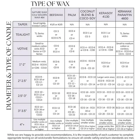 Refer to a candle wick size chart for general recommendations based on candle diameter and wax type. These charts are a helpful starting point, but they should always be used alongside burn testing.